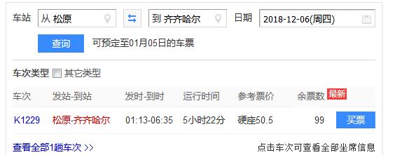 1、可以坐松原到齐齐哈尔的火车,每天有一趟,大约需要五个半小时到达齐齐哈尔,硬座50.5元,齐齐哈尔到漠河一天有三趟车,大约需要11个小时左右,硬座119元,硬卧252元。