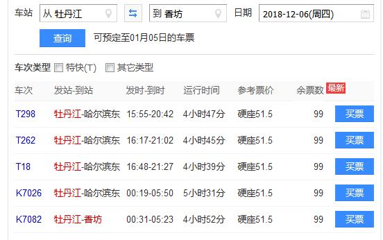 牡丹江到香坊的火车需要4小时50分钟,硬座51.5元。然后从哈尔滨到漠河,13小时52分钟票价279.5元。