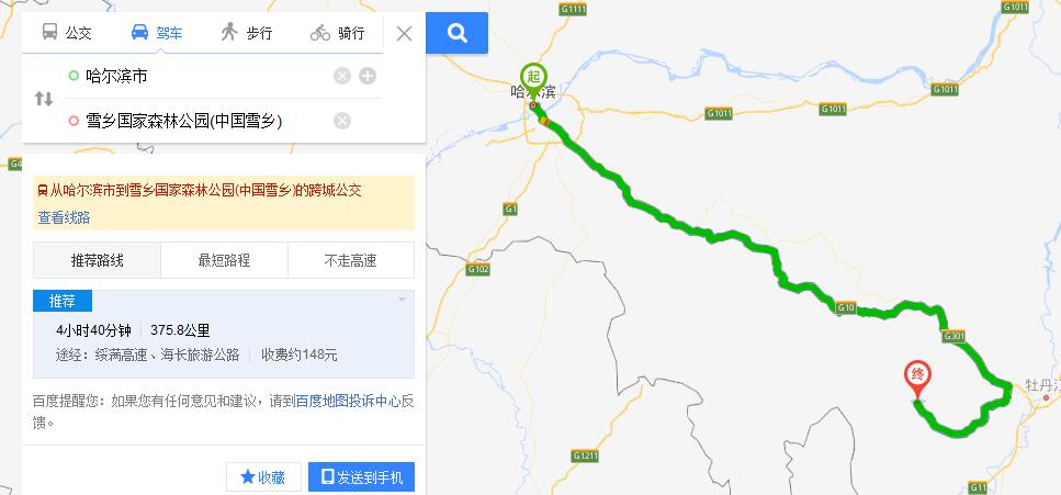 哈尔滨到雪乡自驾线路:需要4小时33分钟,375.8公里