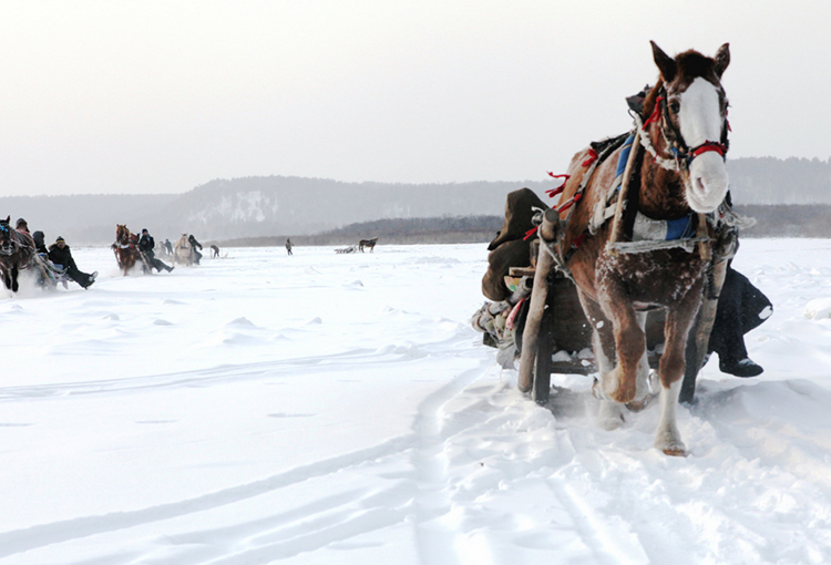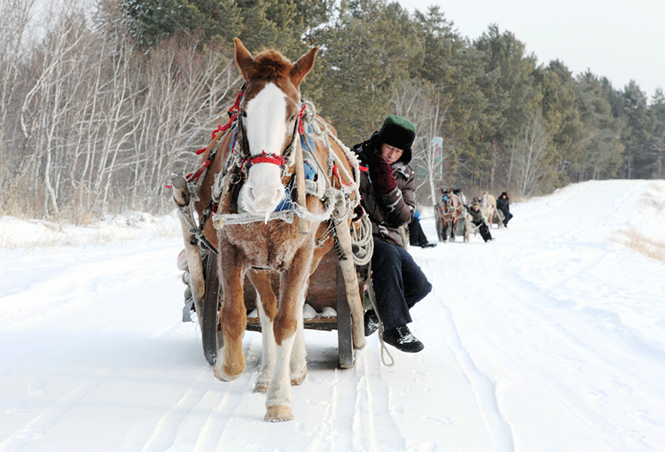 每天一大早,村里各家各户都带好了干粮,喂好了马,随后长鞭炸响,马儿嘶鸣,威风凛凛的马爬犁队伍就向山林里进发去拉木头。一个冬天下来每家的马爬犁少说也能挣个万八千元,这一度成为北极村人的主要经济来源。