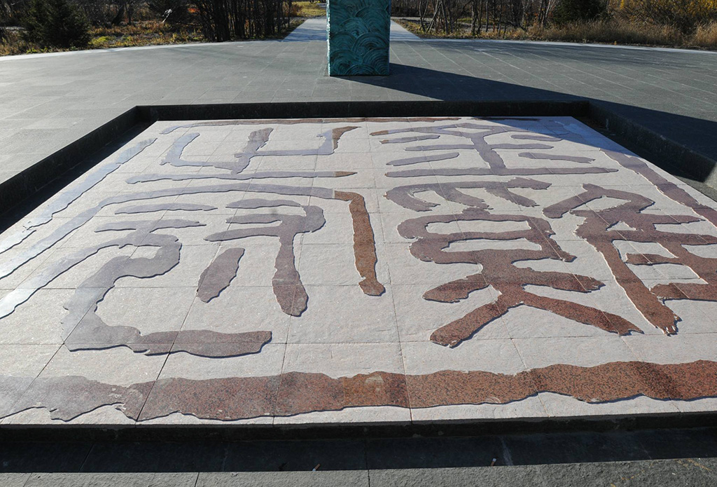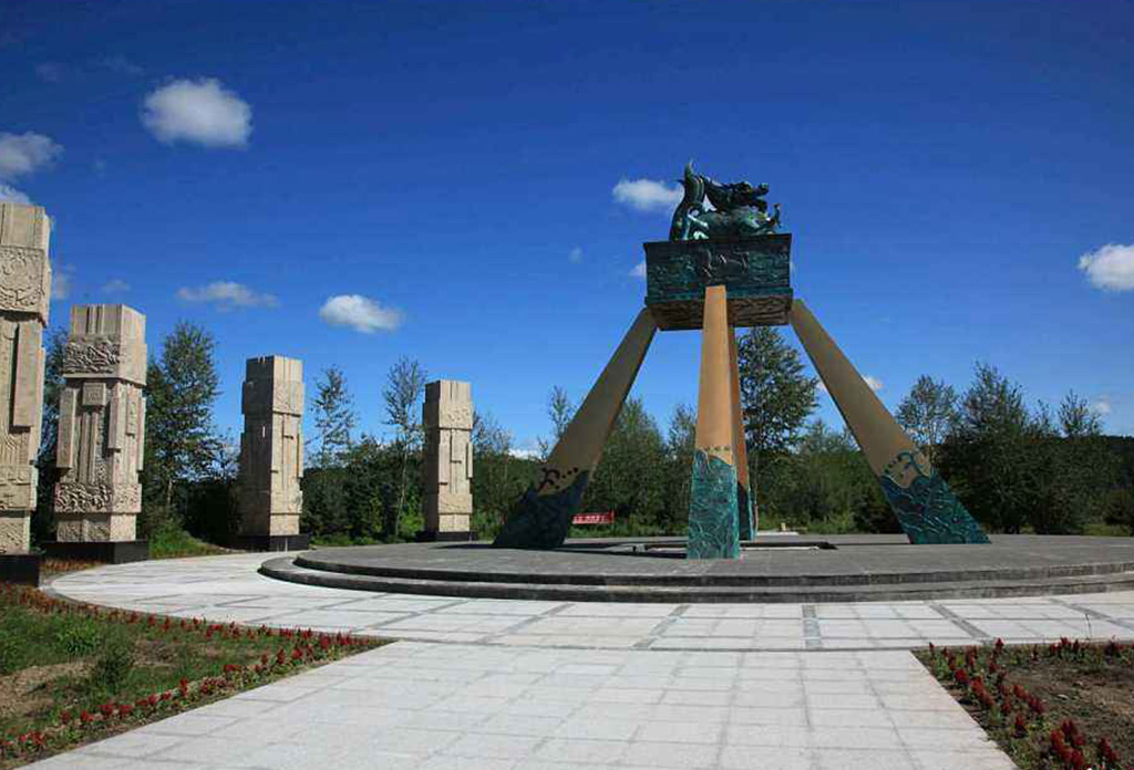 同时,在阳光的照射下,光芒象征着漠河所特有的神奇天象北极光,锻铜纹饰用传统的水纹进行修饰,在五行中北方属水,取滋润、积蓄之意,象征着龙江大地的母亲 河黑龙江,正是神奇北极光、悠悠黑龙江的真实写照;基础部分引用了天圆地方的概念,将四象与八卦的传统国学理论融入其中,雕塑主体延伸的四根图腾柱,分别展示了漠河特有的天象、地景、人文、历史,预示着对漠河未来发展的期盼。